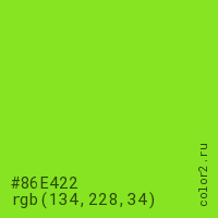 Цвет #86E422 в цветовой модели RGB обозначается тремя октетами (134, 228, 34) в десятичном формате и #86E422 в шестнадцатиричном (hex) формате, которые являются интенсивностью красного 134 (hex 86), интенсивность зелёного 228 (hex E4) и интенсивность синего 34 (hex 22).