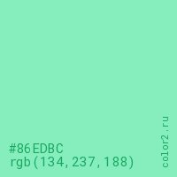 Цвет #86EDBC в цветовой модели RGB обозначается тремя октетами (134, 237, 188) в десятичном формате и #86EDBC в шестнадцатиричном (hex) формате, которые являются интенсивностью красного 134 (hex 86), интенсивность зелёного 237 (hex ED) и интенсивность синего 188 (hex BC).