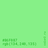 Цвет #86F087 в цветовой модели RGB обозначается тремя октетами (134, 240, 135) в десятичном формате и #86F087 в шестнадцатиричном (hex) формате, которые являются интенсивностью красного 134 (hex 86), интенсивность зелёного 240 (hex F0) и интенсивность синего 135 (hex 87).
