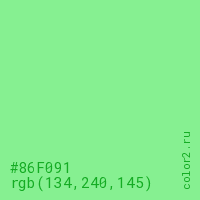 Цвет #86F091 в цветовой модели RGB обозначается тремя октетами (134, 240, 145) в десятичном формате и #86F091 в шестнадцатиричном (hex) формате, которые являются интенсивностью красного 134 (hex 86), интенсивность зелёного 240 (hex F0) и интенсивность синего 145 (hex 91).