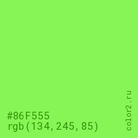 Цвет #86F555 в цветовой модели RGB обозначается тремя октетами (134, 245, 85) в десятичном формате и #86F555 в шестнадцатиричном (hex) формате, которые являются интенсивностью красного 134 (hex 86), интенсивность зелёного 245 (hex F5) и интенсивность синего 85 (hex 55).