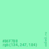 Цвет #86F7B8 в цветовой модели RGB обозначается тремя октетами (134, 247, 184) в десятичном формате и #86F7B8 в шестнадцатиричном (hex) формате, которые являются интенсивностью красного 134 (hex 86), интенсивность зелёного 247 (hex F7) и интенсивность синего 184 (hex B8).
