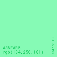 Цвет #86FAB5 в цветовой модели RGB обозначается тремя октетами (134, 250, 181) в десятичном формате и #86FAB5 в шестнадцатиричном (hex) формате, которые являются интенсивностью красного 134 (hex 86), интенсивность зелёного 250 (hex FA) и интенсивность синего 181 (hex B5).