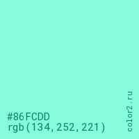 Цвет #86FCDD в цветовой модели RGB обозначается тремя октетами (134, 252, 221) в десятичном формате и #86FCDD в шестнадцатиричном (hex) формате, которые являются интенсивностью красного 134 (hex 86), интенсивность зелёного 252 (hex FC) и интенсивность синего 221 (hex DD).