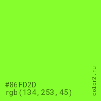 Цвет #86FD2D в цветовой модели RGB обозначается тремя октетами (134, 253, 45) в десятичном формате и #86FD2D в шестнадцатиричном (hex) формате, которые являются интенсивностью красного 134 (hex 86), интенсивность зелёного 253 (hex FD) и интенсивность синего 45 (hex 2D).