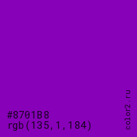 Цвет #8701B8 в цветовой модели RGB обозначается тремя октетами (135, 1, 184) в десятичном формате и #8701B8 в шестнадцатиричном (hex) формате, которые являются интенсивностью красного 135 (hex 87), интенсивность зелёного 1 (hex 01) и интенсивность синего 184 (hex B8).