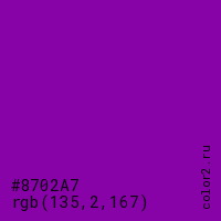 Цвет #8702A7 в цветовой модели RGB обозначается тремя октетами (135, 2, 167) в десятичном формате и #8702A7 в шестнадцатиричном (hex) формате, которые являются интенсивностью красного 135 (hex 87), интенсивность зелёного 2 (hex 02) и интенсивность синего 167 (hex A7).