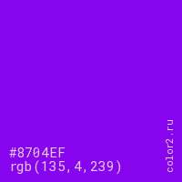 Цвет #8704EF в цветовой модели RGB обозначается тремя октетами (135, 4, 239) в десятичном формате и #8704EF в шестнадцатиричном (hex) формате, которые являются интенсивностью красного 135 (hex 87), интенсивность зелёного 4 (hex 04) и интенсивность синего 239 (hex EF).