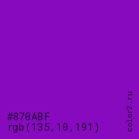 Цвет #870ABF в цветовой модели RGB обозначается тремя октетами (135, 10, 191) в десятичном формате и #870ABF в шестнадцатиричном (hex) формате, которые являются интенсивностью красного 135 (hex 87), интенсивность зелёного 10 (hex 0A) и интенсивность синего 191 (hex BF).