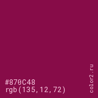 Цвет #870C48 в цветовой модели RGB обозначается тремя октетами (135, 12, 72) в десятичном формате и #870C48 в шестнадцатиричном (hex) формате, которые являются интенсивностью красного 135 (hex 87), интенсивность зелёного 12 (hex 0C) и интенсивность синего 72 (hex 48).