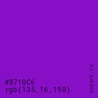 Цвет #8710C6 в цветовой модели RGB обозначается тремя октетами (135, 16, 198) в десятичном формате и #8710C6 в шестнадцатиричном (hex) формате, которые являются интенсивностью красного 135 (hex 87), интенсивность зелёного 16 (hex 10) и интенсивность синего 198 (hex C6).