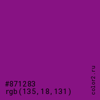 Цвет #871283 в цветовой модели RGB обозначается тремя октетами (135, 18, 131) в десятичном формате и #871283 в шестнадцатиричном (hex) формате, которые являются интенсивностью красного 135 (hex 87), интенсивность зелёного 18 (hex 12) и интенсивность синего 131 (hex 83).