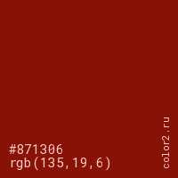 Цвет #871306 в цветовой модели RGB обозначается тремя октетами (135, 19, 6) в десятичном формате и #871306 в шестнадцатиричном (hex) формате, которые являются интенсивностью красного 135 (hex 87), интенсивность зелёного 19 (hex 13) и интенсивность синего 6 (hex 06).