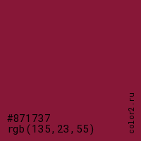 Цвет #871737 в цветовой модели RGB обозначается тремя октетами (135, 23, 55) в десятичном формате и #871737 в шестнадцатиричном (hex) формате, которые являются интенсивностью красного 135 (hex 87), интенсивность зелёного 23 (hex 17) и интенсивность синего 55 (hex 37).