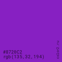 Цвет #8720C2 в цветовой модели RGB обозначается тремя октетами (135, 32, 194) в десятичном формате и #8720C2 в шестнадцатиричном (hex) формате, которые являются интенсивностью красного 135 (hex 87), интенсивность зелёного 32 (hex 20) и интенсивность синего 194 (hex C2).