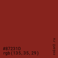 Цвет #87231D в цветовой модели RGB обозначается тремя октетами (135, 35, 29) в десятичном формате и #87231D в шестнадцатиричном (hex) формате, которые являются интенсивностью красного 135 (hex 87), интенсивность зелёного 35 (hex 23) и интенсивность синего 29 (hex 1D).