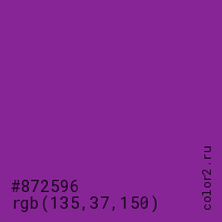 Цвет #872596 в цветовой модели RGB обозначается тремя октетами (135, 37, 150) в десятичном формате и #872596 в шестнадцатиричном (hex) формате, которые являются интенсивностью красного 135 (hex 87), интенсивность зелёного 37 (hex 25) и интенсивность синего 150 (hex 96).