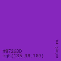 Цвет #8726BD в цветовой модели RGB обозначается тремя октетами (135, 38, 189) в десятичном формате и #8726BD в шестнадцатиричном (hex) формате, которые являются интенсивностью красного 135 (hex 87), интенсивность зелёного 38 (hex 26) и интенсивность синего 189 (hex BD).