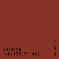 Цвет #873328 в цветовой модели RGB обозначается тремя октетами (135, 51, 40) в десятичном формате и #873328 в шестнадцатиричном (hex) формате, которые являются интенсивностью красного 135 (hex 87), интенсивность зелёного 51 (hex 33) и интенсивность синего 40 (hex 28).