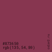 Цвет #873650 в цветовой модели RGB обозначается тремя октетами (135, 54, 80) в десятичном формате и #873650 в шестнадцатиричном (hex) формате, которые являются интенсивностью красного 135 (hex 87), интенсивность зелёного 54 (hex 36) и интенсивность синего 80 (hex 50).