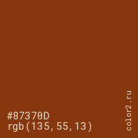 Цвет #87370D в цветовой модели RGB обозначается тремя октетами (135, 55, 13) в десятичном формате и #87370D в шестнадцатиричном (hex) формате, которые являются интенсивностью красного 135 (hex 87), интенсивность зелёного 55 (hex 37) и интенсивность синего 13 (hex 0D).