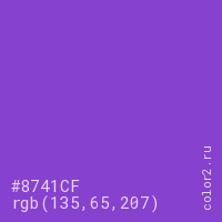 Цвет #8741CF в цветовой модели RGB обозначается тремя октетами (135, 65, 207) в десятичном формате и #8741CF в шестнадцатиричном (hex) формате, которые являются интенсивностью красного 135 (hex 87), интенсивность зелёного 65 (hex 41) и интенсивность синего 207 (hex CF).
