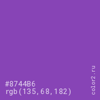 Цвет #8744B6 в цветовой модели RGB обозначается тремя октетами (135, 68, 182) в десятичном формате и #8744B6 в шестнадцатиричном (hex) формате, которые являются интенсивностью красного 135 (hex 87), интенсивность зелёного 68 (hex 44) и интенсивность синего 182 (hex B6).