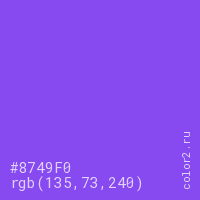 Цвет #8749F0 в цветовой модели RGB обозначается тремя октетами (135, 73, 240) в десятичном формате и #8749F0 в шестнадцатиричном (hex) формате, которые являются интенсивностью красного 135 (hex 87), интенсивность зелёного 73 (hex 49) и интенсивность синего 240 (hex F0).