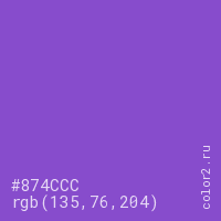 Цвет #874CCC в цветовой модели RGB обозначается тремя октетами (135, 76, 204) в десятичном формате и #874CCC в шестнадцатиричном (hex) формате, которые являются интенсивностью красного 135 (hex 87), интенсивность зелёного 76 (hex 4C) и интенсивность синего 204 (hex CC).