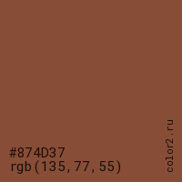 Цвет #874D37 в цветовой модели RGB обозначается тремя октетами (135, 77, 55) в десятичном формате и #874D37 в шестнадцатиричном (hex) формате, которые являются интенсивностью красного 135 (hex 87), интенсивность зелёного 77 (hex 4D) и интенсивность синего 55 (hex 37).
