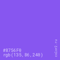 Цвет #8756F0 в цветовой модели RGB обозначается тремя октетами (135, 86, 240) в десятичном формате и #8756F0 в шестнадцатиричном (hex) формате, которые являются интенсивностью красного 135 (hex 87), интенсивность зелёного 86 (hex 56) и интенсивность синего 240 (hex F0).