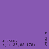 Цвет #8758B2 в цветовой модели RGB обозначается тремя октетами (135, 88, 178) в десятичном формате и #8758B2 в шестнадцатиричном (hex) формате, которые являются интенсивностью красного 135 (hex 87), интенсивность зелёного 88 (hex 58) и интенсивность синего 178 (hex B2).