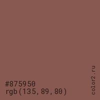 Цвет #875950 в цветовой модели RGB обозначается тремя октетами (135, 89, 80) в десятичном формате и #875950 в шестнадцатиричном (hex) формате, которые являются интенсивностью красного 135 (hex 87), интенсивность зелёного 89 (hex 59) и интенсивность синего 80 (hex 50).