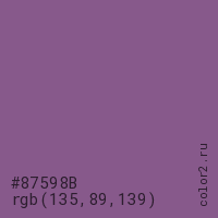 Цвет #87598B в цветовой модели RGB обозначается тремя октетами (135, 89, 139) в десятичном формате и #87598B в шестнадцатиричном (hex) формате, которые являются интенсивностью красного 135 (hex 87), интенсивность зелёного 89 (hex 59) и интенсивность синего 139 (hex 8B).