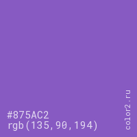 Цвет #875AC2 в цветовой модели RGB обозначается тремя октетами (135, 90, 194) в десятичном формате и #875AC2 в шестнадцатиричном (hex) формате, которые являются интенсивностью красного 135 (hex 87), интенсивность зелёного 90 (hex 5A) и интенсивность синего 194 (hex C2).