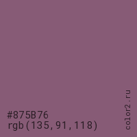 Цвет #875B76 в цветовой модели RGB обозначается тремя октетами (135, 91, 118) в десятичном формате и #875B76 в шестнадцатиричном (hex) формате, которые являются интенсивностью красного 135 (hex 87), интенсивность зелёного 91 (hex 5B) и интенсивность синего 118 (hex 76).