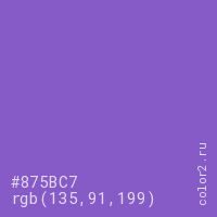 Цвет #875BC7 в цветовой модели RGB обозначается тремя октетами (135, 91, 199) в десятичном формате и #875BC7 в шестнадцатиричном (hex) формате, которые являются интенсивностью красного 135 (hex 87), интенсивность зелёного 91 (hex 5B) и интенсивность синего 199 (hex C7).