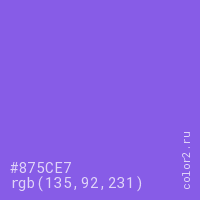 Цвет #875CE7 в цветовой модели RGB обозначается тремя октетами (135, 92, 231) в десятичном формате и #875CE7 в шестнадцатиричном (hex) формате, которые являются интенсивностью красного 135 (hex 87), интенсивность зелёного 92 (hex 5C) и интенсивность синего 231 (hex E7).