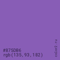 Цвет #875DB6 в цветовой модели RGB обозначается тремя октетами (135, 93, 182) в десятичном формате и #875DB6 в шестнадцатиричном (hex) формате, которые являются интенсивностью красного 135 (hex 87), интенсивность зелёного 93 (hex 5D) и интенсивность синего 182 (hex B6).