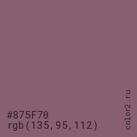 Цвет #875F70 в цветовой модели RGB обозначается тремя октетами (135, 95, 112) в десятичном формате и #875F70 в шестнадцатиричном (hex) формате, которые являются интенсивностью красного 135 (hex 87), интенсивность зелёного 95 (hex 5F) и интенсивность синего 112 (hex 70).