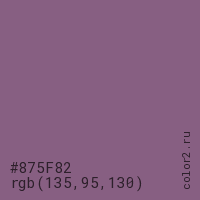 Цвет #875F82 в цветовой модели RGB обозначается тремя октетами (135, 95, 130) в десятичном формате и #875F82 в шестнадцатиричном (hex) формате, которые являются интенсивностью красного 135 (hex 87), интенсивность зелёного 95 (hex 5F) и интенсивность синего 130 (hex 82).