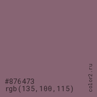 Цвет #876473 в цветовой модели RGB обозначается тремя октетами (135, 100, 115) в десятичном формате и #876473 в шестнадцатиричном (hex) формате, которые являются интенсивностью красного 135 (hex 87), интенсивность зелёного 100 (hex 64) и интенсивность синего 115 (hex 73).