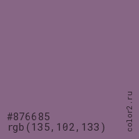 Цвет #876685 в цветовой модели RGB обозначается тремя октетами (135, 102, 133) в десятичном формате и #876685 в шестнадцатиричном (hex) формате, которые являются интенсивностью красного 135 (hex 87), интенсивность зелёного 102 (hex 66) и интенсивность синего 133 (hex 85).