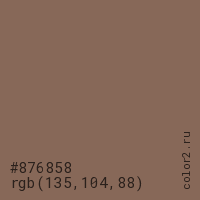 Цвет #876858 в цветовой модели RGB обозначается тремя октетами (135, 104, 88) в десятичном формате и #876858 в шестнадцатиричном (hex) формате, которые являются интенсивностью красного 135 (hex 87), интенсивность зелёного 104 (hex 68) и интенсивность синего 88 (hex 58).
