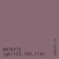 Цвет #876972 в цветовой модели RGB обозначается тремя октетами (135, 105, 114) в десятичном формате и #876972 в шестнадцатиричном (hex) формате, которые являются интенсивностью красного 135 (hex 87), интенсивность зелёного 105 (hex 69) и интенсивность синего 114 (hex 72).