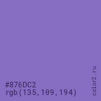 Цвет #876DC2 в цветовой модели RGB обозначается тремя октетами (135, 109, 194) в десятичном формате и #876DC2 в шестнадцатиричном (hex) формате, которые являются интенсивностью красного 135 (hex 87), интенсивность зелёного 109 (hex 6D) и интенсивность синего 194 (hex C2).