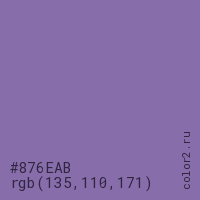 Цвет #876EAB в цветовой модели RGB обозначается тремя октетами (135, 110, 171) в десятичном формате и #876EAB в шестнадцатиричном (hex) формате, которые являются интенсивностью красного 135 (hex 87), интенсивность зелёного 110 (hex 6E) и интенсивность синего 171 (hex AB).
