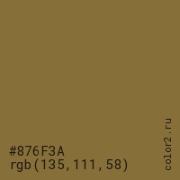 Цвет #876F3A в цветовой модели RGB обозначается тремя октетами (135, 111, 58) в десятичном формате и #876F3A в шестнадцатиричном (hex) формате, которые являются интенсивностью красного 135 (hex 87), интенсивность зелёного 111 (hex 6F) и интенсивность синего 58 (hex 3A).