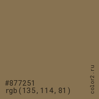 Цвет #877251 в цветовой модели RGB обозначается тремя октетами (135, 114, 81) в десятичном формате и #877251 в шестнадцатиричном (hex) формате, которые являются интенсивностью красного 135 (hex 87), интенсивность зелёного 114 (hex 72) и интенсивность синего 81 (hex 51).