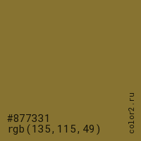 Цвет #877331 в цветовой модели RGB обозначается тремя октетами (135, 115, 49) в десятичном формате и #877331 в шестнадцатиричном (hex) формате, которые являются интенсивностью красного 135 (hex 87), интенсивность зелёного 115 (hex 73) и интенсивность синего 49 (hex 31).